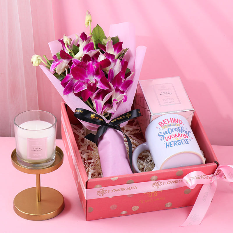 Celebrate the remarkable women in your life with this stunning Women’s Day Gift Set. It includes a beautifully designed Ceramic Mug with an empowering message, a soothing FlowerAura Rose & Oud Candle for moments of relaxation, and a stunning Purple Orchid Bouquet that adds elegance to any space. Presented in a delicate Pink Open Tray, this hamper is a perfect combination of beauty, fragrance, and thoughtfulness—sure to make her day unforgettable.